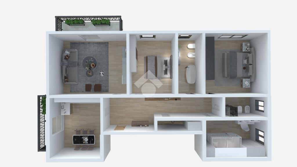 L’ingresso si apre su una spaziosa e luminosa zona giorno, caratterizzata dal soggiorno e dalla cucina abitabile separata. Inoltre sono presenti due terrazzi, uno con accesso dalla cucina e uno dal soggiorno.
